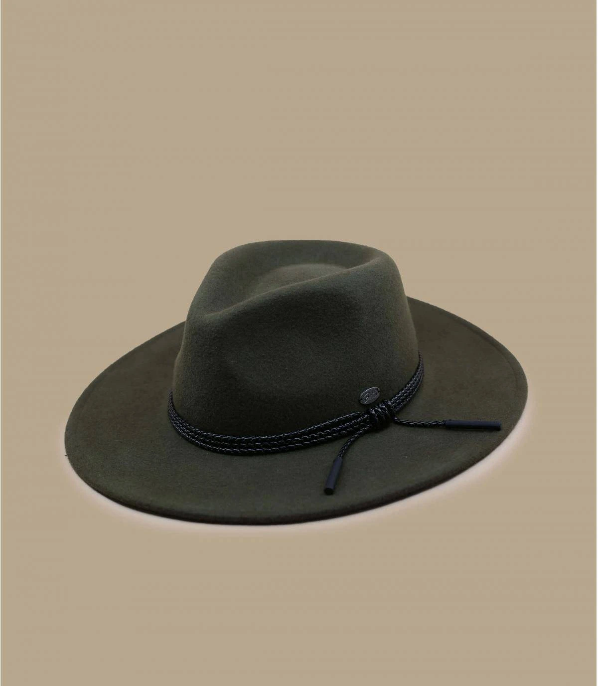 Le feutre de laine qui compose ce superbe fedora vert est brossé et poli pour lui donner une texture soyeuse et légèrement luisante. À larges bords, ce chapeau est relevé d’un lien tressé en faux cuir.