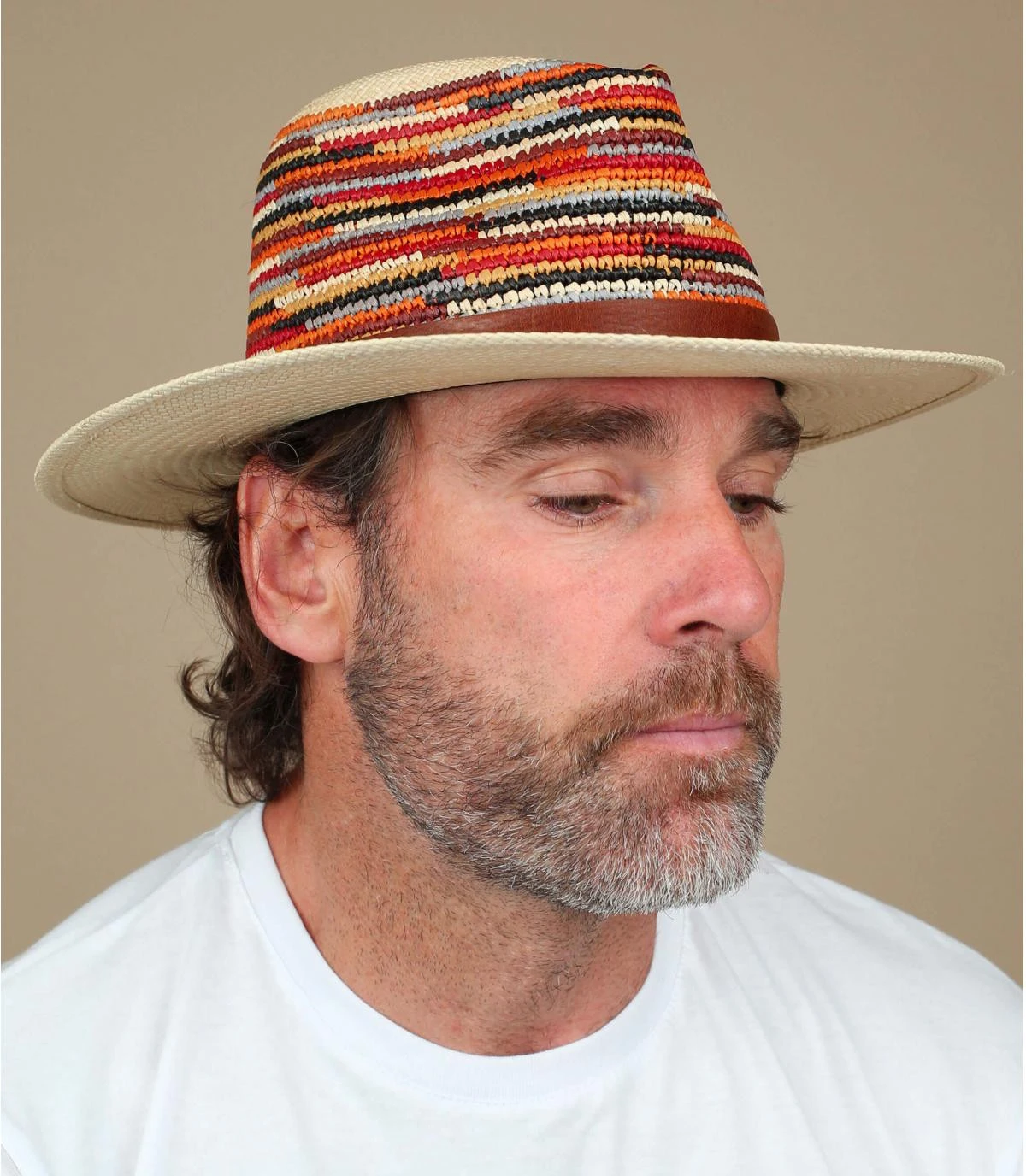 Offrez-vous une véritable création unique, avec ce magnifique chapeau confectionné en authentique paille panama par le spécialiste Bailey of Hollywood. Le tressage multicolore de sa calotte est une œuvre d’art et son bord droit lui donne un port original.