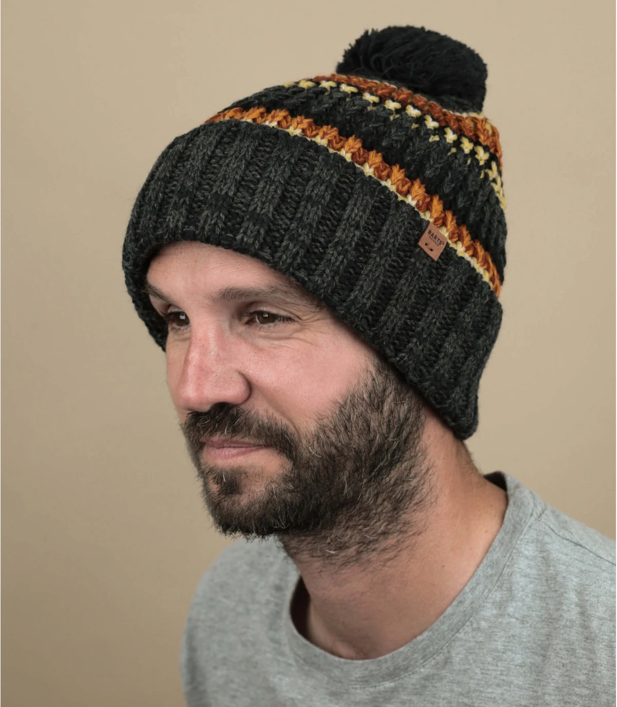 Protégez-vous du froid cet hiver en portant ce bonnet à pompon bleu marine avec des rayures, jaune et noir et un gros pompon. Cet accessoire éco-responsable contient des matériaux recyclés.