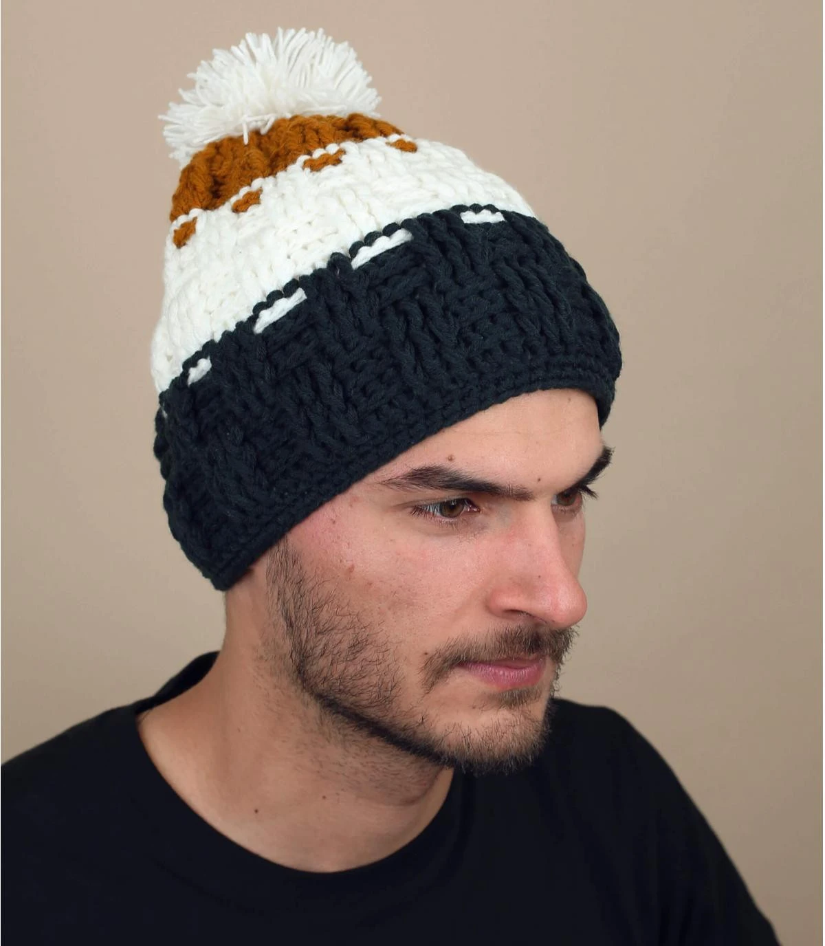 Bonnet pompon pour homme de la marque Capcho. Bonnetavec 3 bandes colorées noire, blanche et curry. Doublure polaire, tricoté à la main au Népal.