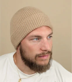 Bonnet en laine recyclée fabriqué en France de couleur camel. Taille unique : 55-60 cm de tour dre tête.