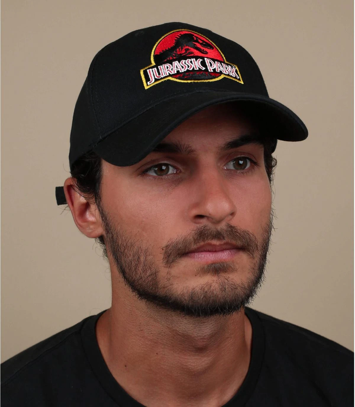 Casquette noire à visière courbée, brodée devant d’un grand patch rond au logo du film Jurassic Park, avec une silhouette menaçante de dinosaure sur fond rouge sang. Un grand classique pour ceux qui ont adoré avoir peur en regardant la saga de l’île aux dinosaures.