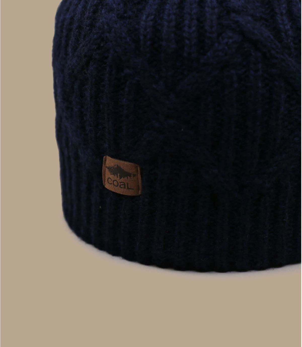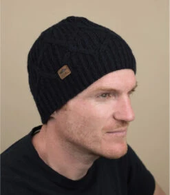 Bonnet homme bleu marine tricoté avec motifs tressés et doublure polaire.