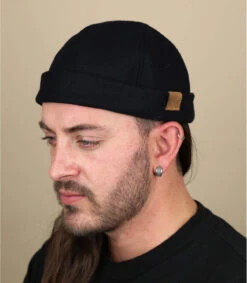 Laissez le vent du large souffler sur vos tenues de ville, avec ce bonnet docker bleu marine, confectionné dans une matière douce et chaude à base de laine. Il est relevé sur le côté d’un petit patch en cuir, gravé de la salutation nautique « Ahoy ».