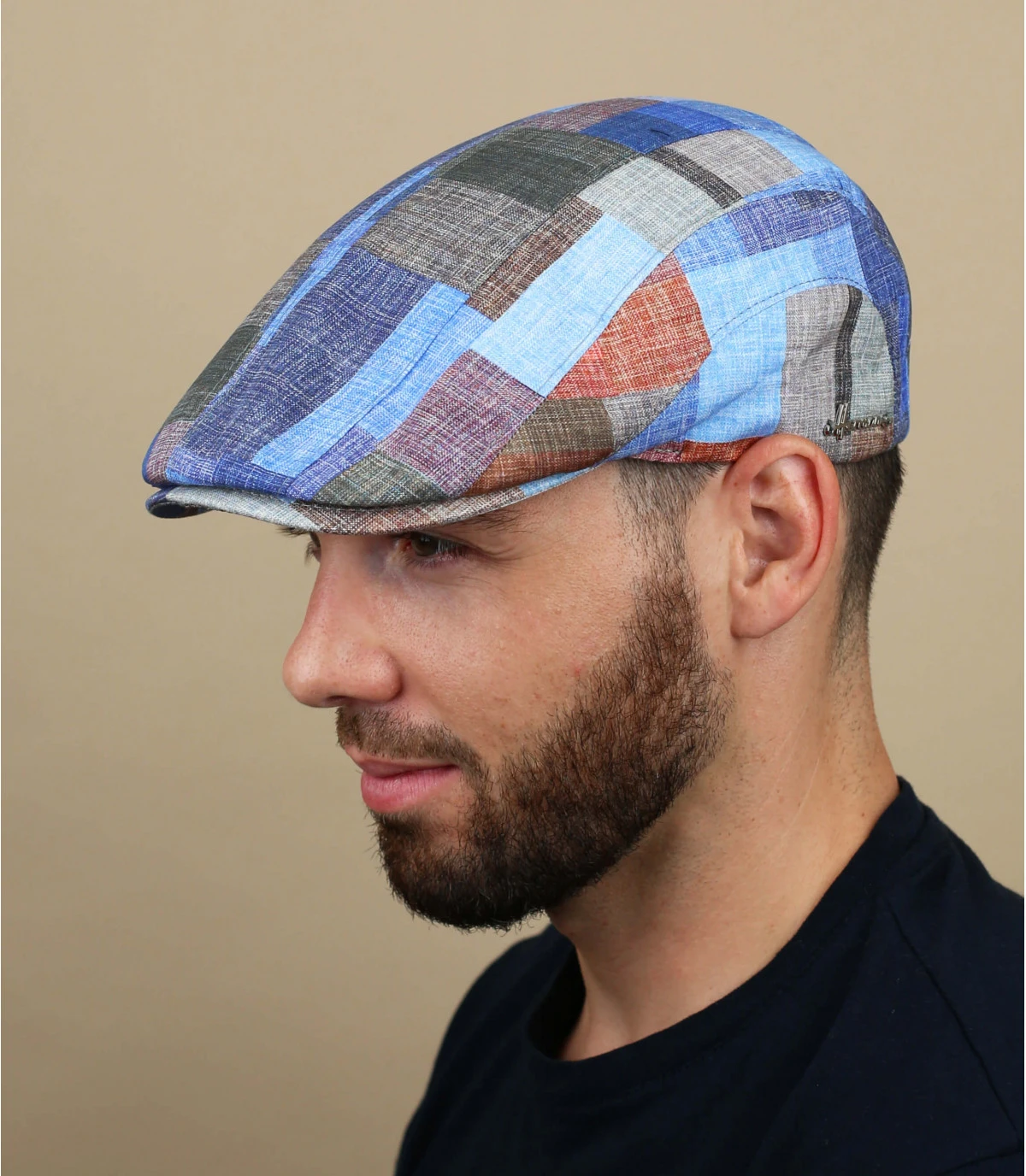 Portez un béret 100 % lin portant le nom de Marlon. Son motif est un patchwork de couleurs pastels bleu et rouge. Rappelant le tweed écossais, Il vous donne un style authentique. La marque se lit à l’arrière.