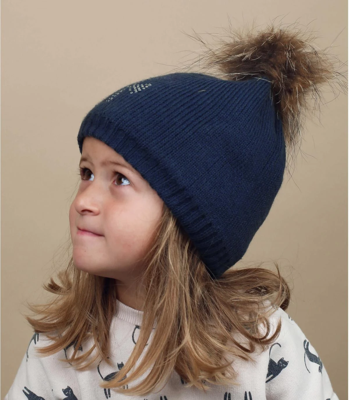 Les filles aussi veulent un bonnet glamour, c’est chose faite avec ce modèle enfant bleu marine, couronné d’un superbe pompon en fourrure véritable et relevé d’un logo en strass de la marque française Pipolaki. Il est intégralement doublé en polaire, pour plus de chaleur.