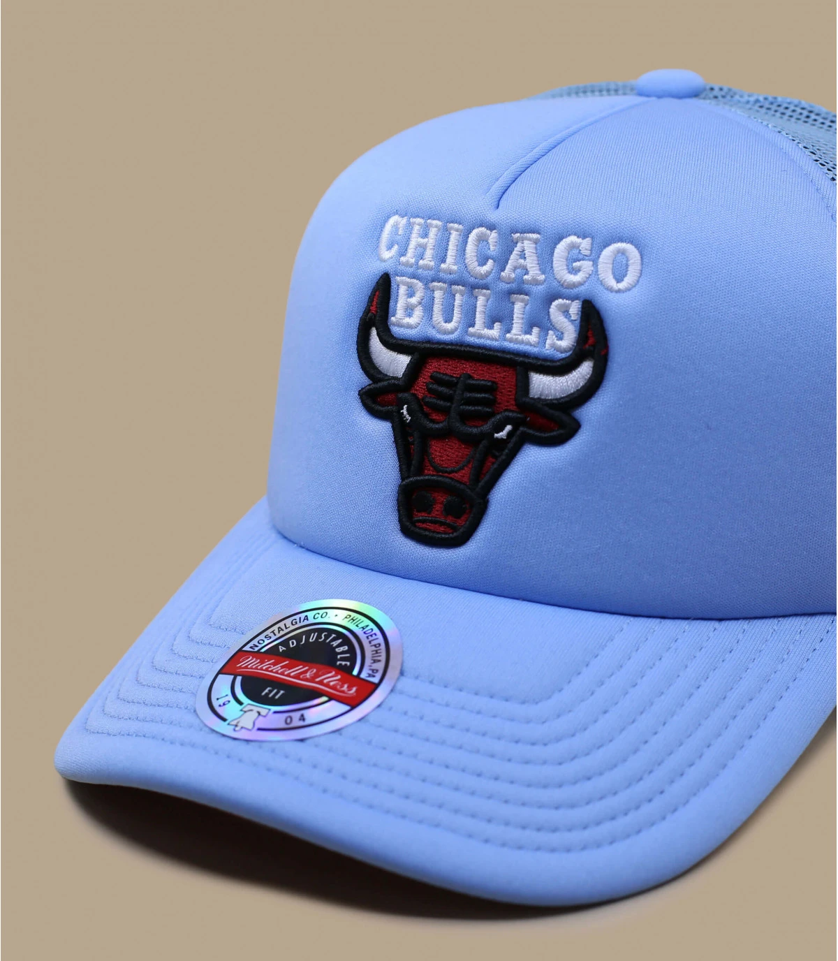 Soyez original avec cette inattendue casquette trucker bleu clair avec le logo des Chicago Bulls. La tête de taureau rouge est la mascotte de l’équipe. Les Chicago Bulls sont la franchise historique de NBA qui cumule tous les records.