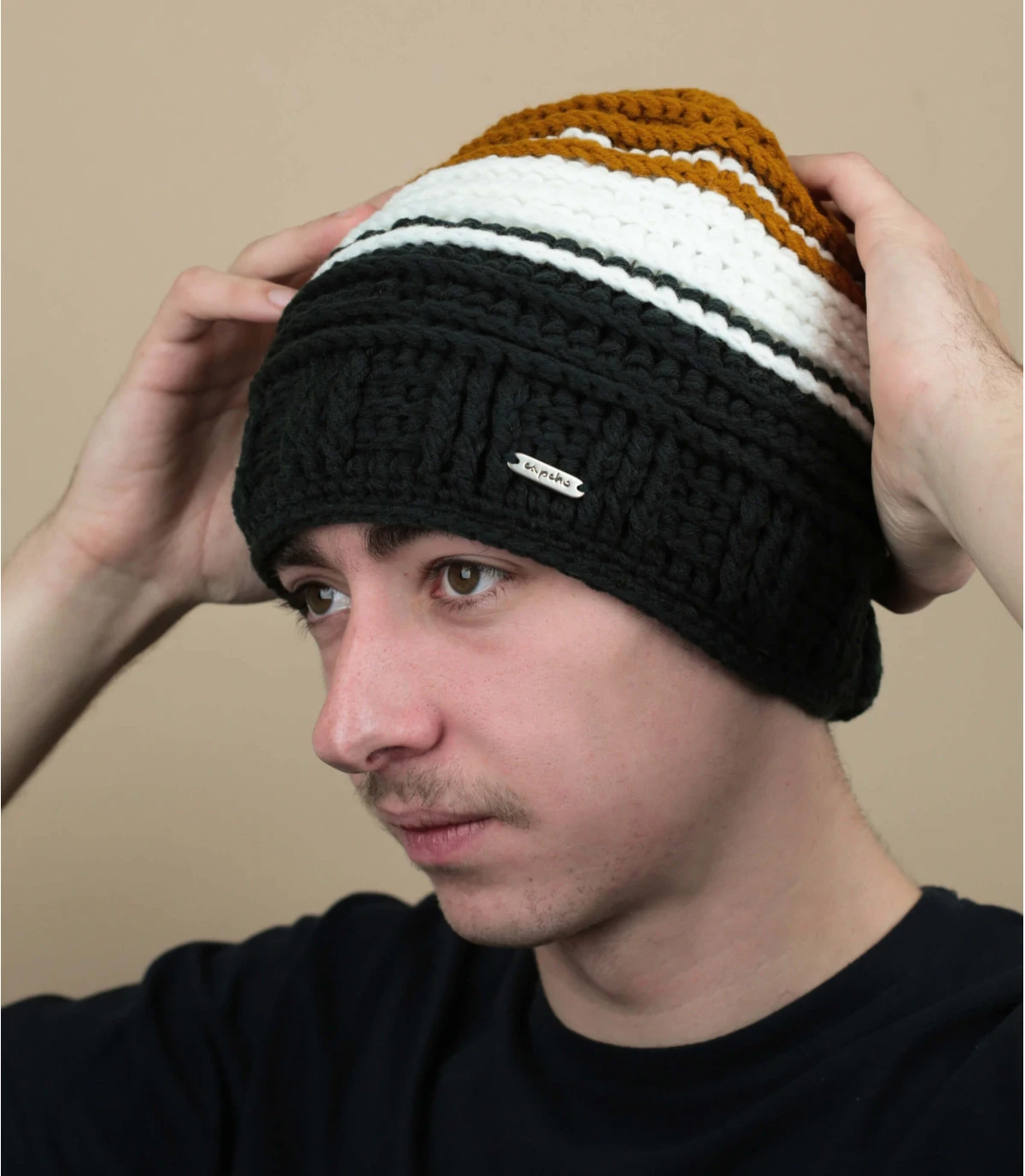 Avec la couleur moutarde qui fait fureur cette année et un effet de tricot à rayures ultra moelleux, ce superbe bonnet court ne quittera plus votre tête lorsque vous sortirez cet hiver. Confectionné à la main au Népal dans l’atelier traditionnel Capcho, il est doublé en polaire douce et chaude.