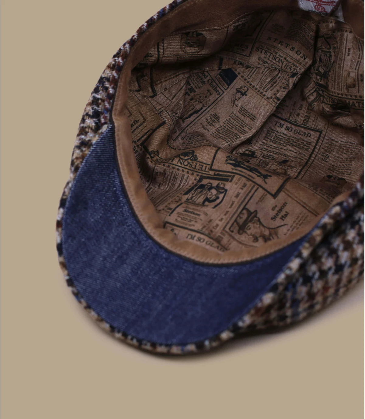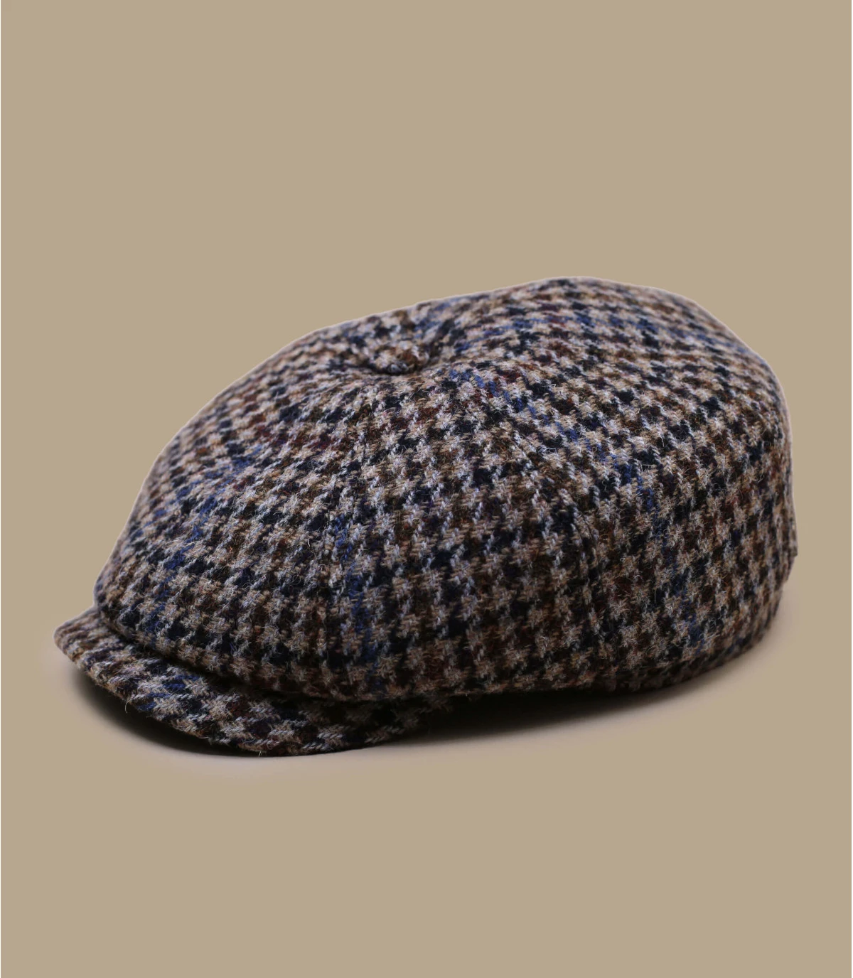 La casquette irlandaise Hatteras est célèbre pour être une protection efficace contre le mauvais temps et les basses températures. Ce modèle arbore un joli motif pied-de-poule beige et noir. Elle est faite en laine vierge Harris Tweed.