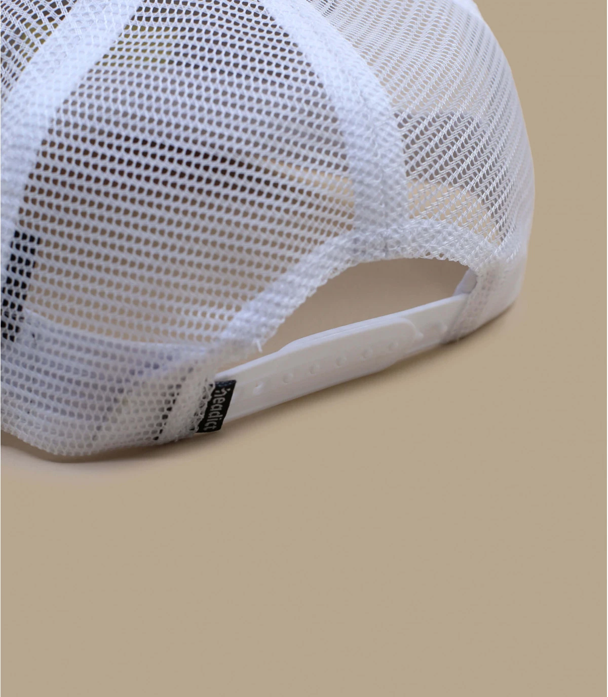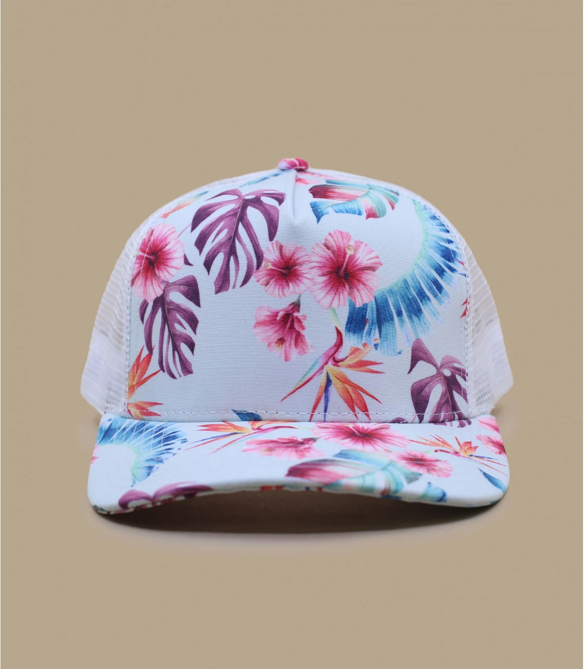 Trucker imprimé floral devant et visière, filet blanc. Languette de réglage à l’arrière. Tour de tête 55 à 60 cm.