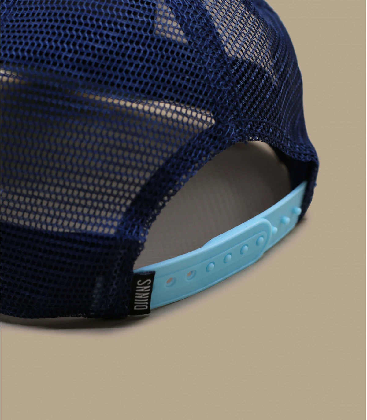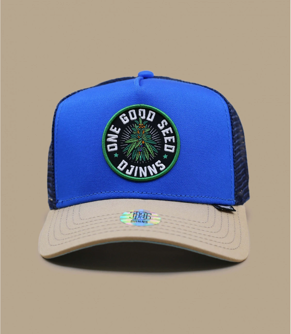 Portez une casquette trucker bleu clair très good vibes avec un filet bleu marine et une visière beige. Elle arbore un logo rond à l’avant avec un dessin de graine, le slogan “Good Seed” et la marque Djinns.
